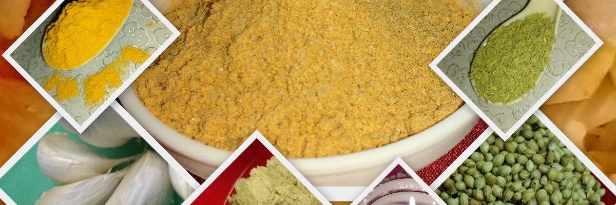 ½ tbs Onion, ½ tbs Garlic, 1 tbs coriander,1 tbs Cumin seeds, ½ tsp ginger powder, 1 tsp Chili, ½ tsp Aniseed (optional), ¼ tsp Fenugreek, ½ tsp Black Pepper, ¼ tsp turmeric powder and ¼ tsp spice extracts powder this is also available in market.