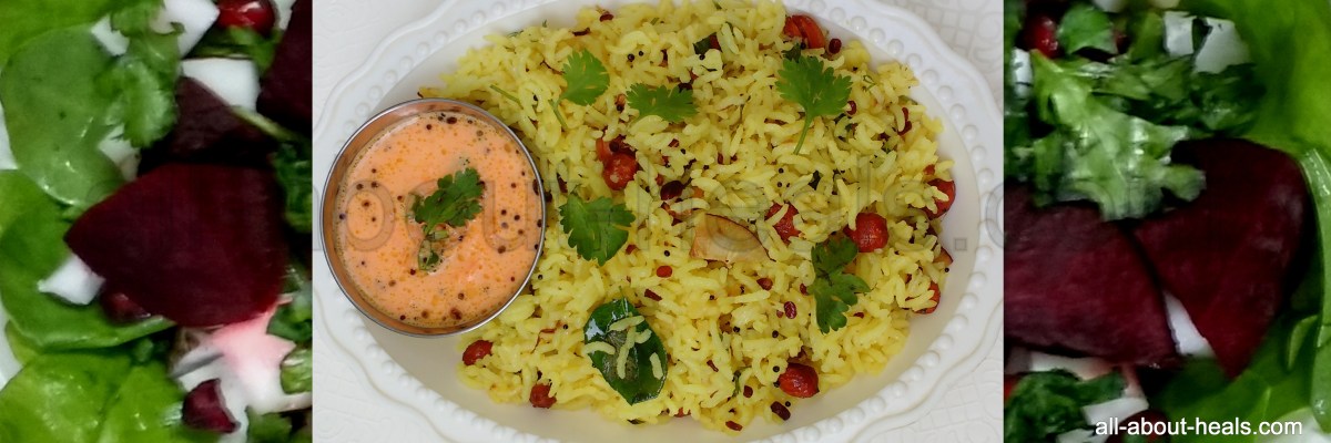 So, here is your Chitranha / lemon rice, and I am going to serve this with some spinach salad and carrot chutney. So, you also can make the spinach and beetroot salad with Chitranha/ lemon rice. For the salad recipe, you can follow the link below.