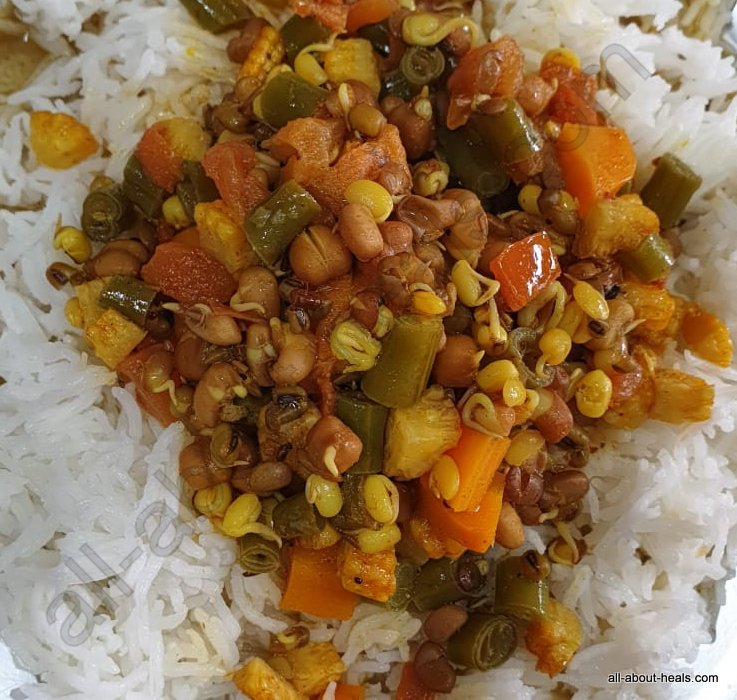 First, wash your rice and make plane rice and keep aside. Now take a presser pan and make the condiment. GO with a step by step add Ghee let it heat, now add cumin, black pepper, cinnamon, and fry nice and add Mix Sprouts (as per your wish, you can use sprouted lentils), salt (as per the taste) and add water as required now mix it well. Close the lid and cook till two whistles. Now let it cool down. Once it cools down, open, and add all the veggies into it. If needed, add some salt as per the taste. Once again, close the lid and cook for one whistle. Now it is done, your recipe is ready to eat. Serve this with hot rice. You can serve this with Pickle and Papad. Enjoy your meal with Deepawali dessert.
